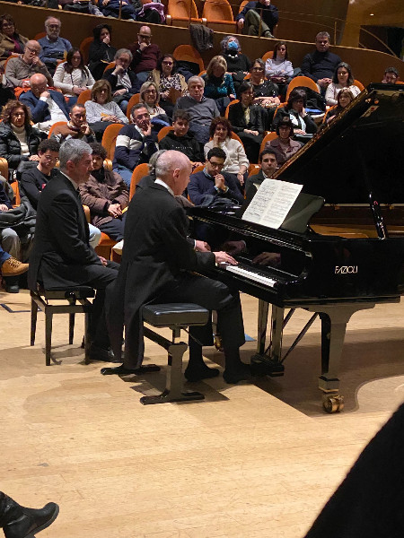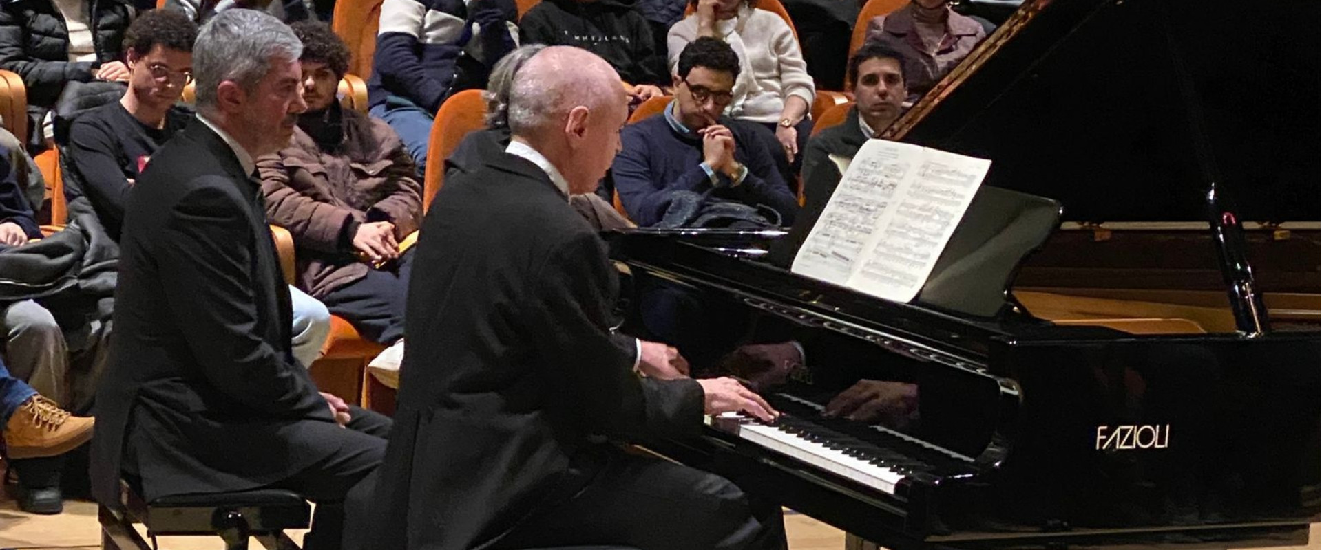 Gli occhi non si staccano dallo spartito nemmeno durante il concerto quando si presenterà con un impeccabile frac, la bocca si muove, forse si accompagna, lo sguardo incontra il pubblico solo nel momento degli applausi. Ma è uno sguardo che va oltre, è già altrove...
