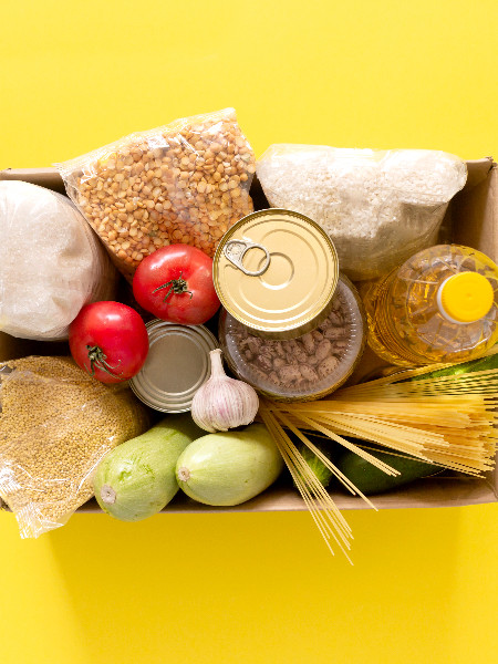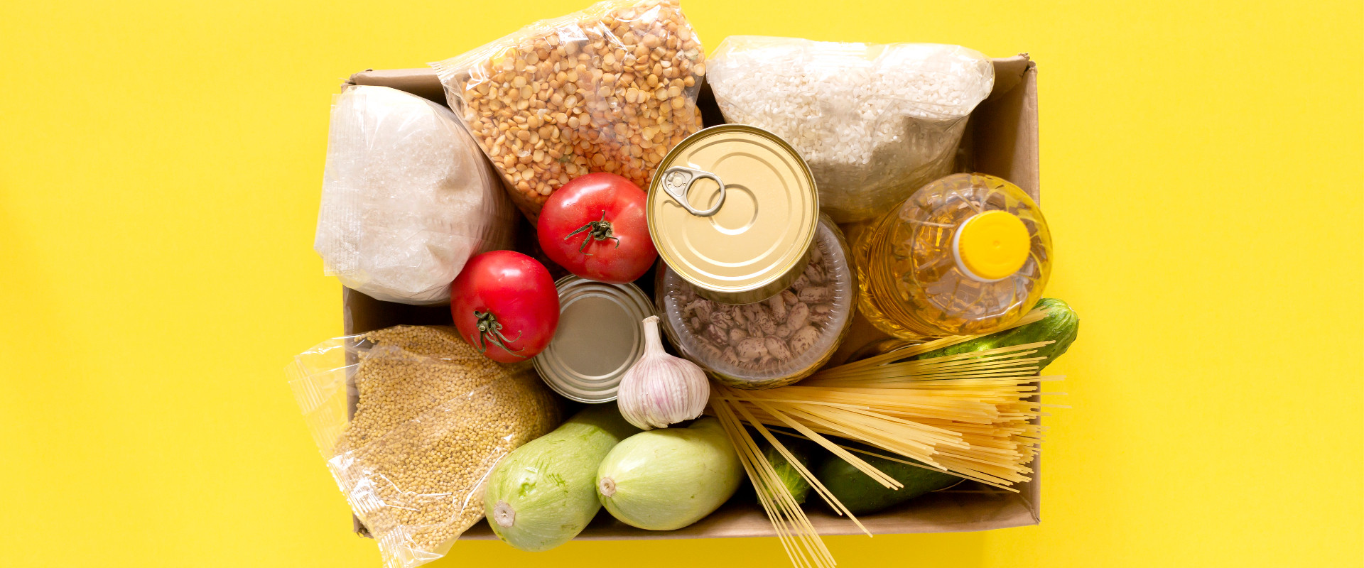 Donation. Food supplies crisis food stock for quarantine isolation period on yellow background. Rice, peas, cereals, canned food, oil, vegetables, mask, sanitizer. Food delivery, coronavirus
