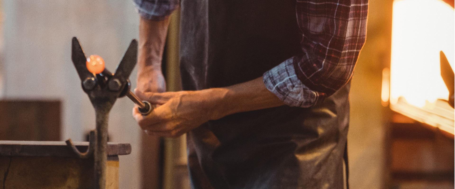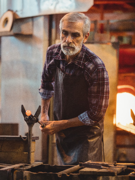 Glassblower shaping a molten glass at glassblowing factory