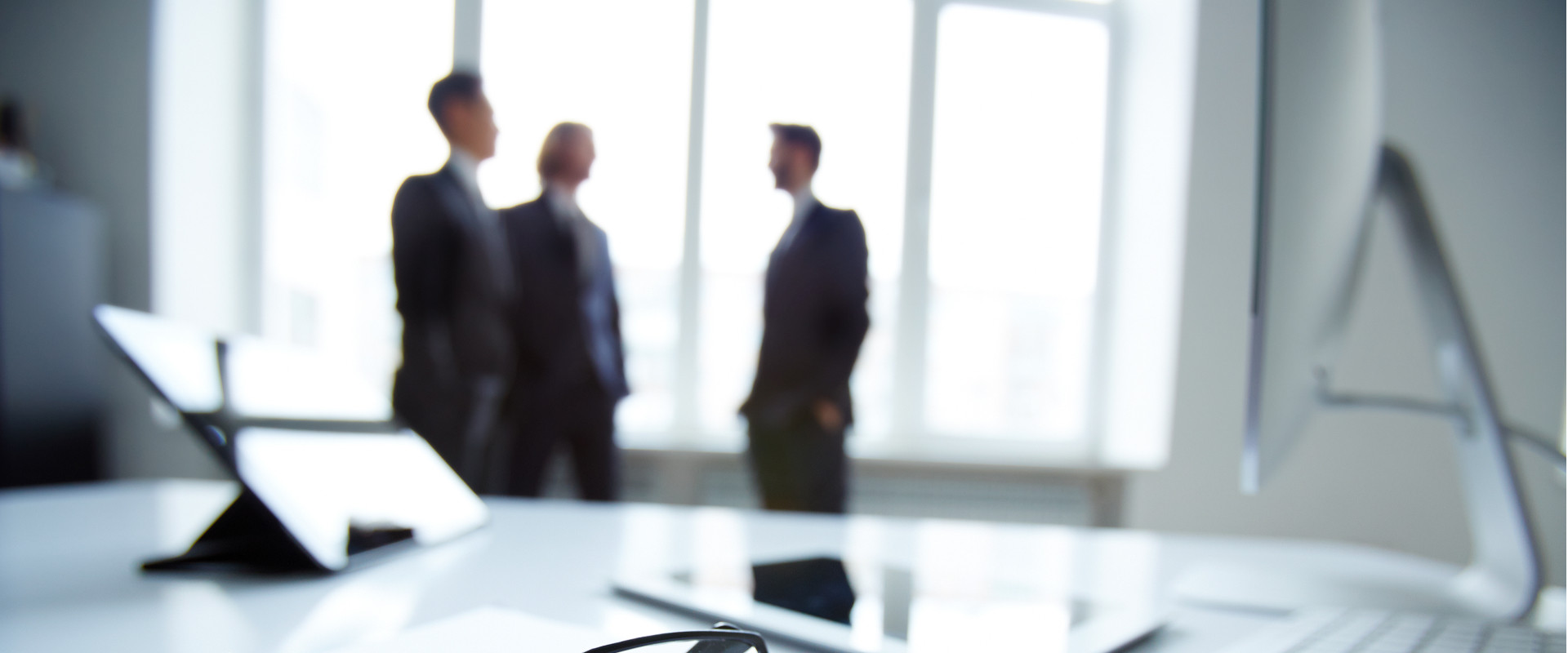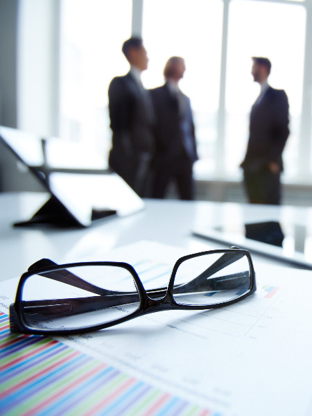 Technological devices, eyeglasses and financial document at workplace on background of three businessmen discussing ideas