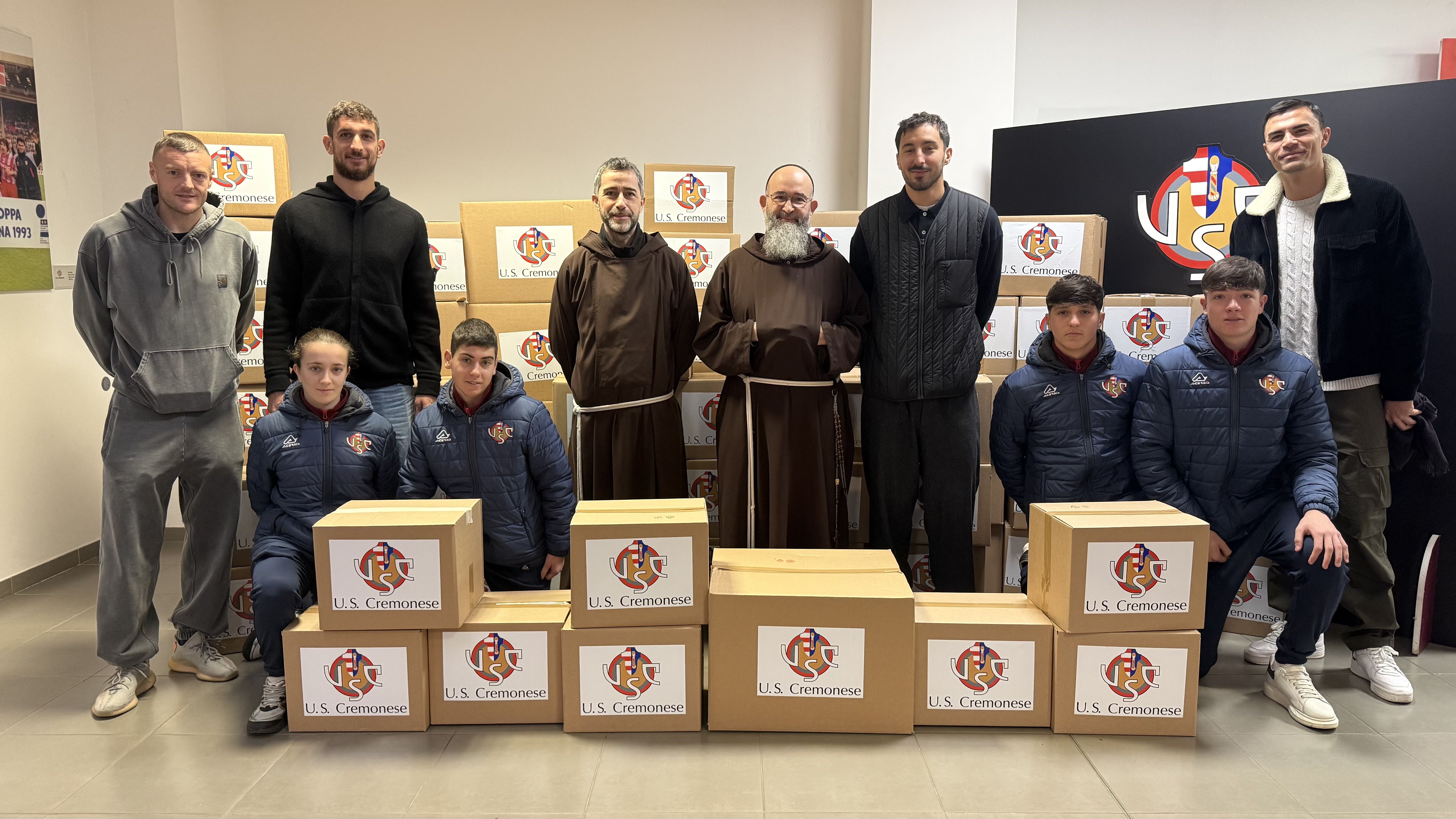 La consegna dei generi alimentari ai Cappuccini di Cremona. Tra i calciatori della Cremonese, da sinistra, Jamie Vardy, Matteo Bianchetti, Federico Ceccherini ed Emil Audero [foto US Cremonese]